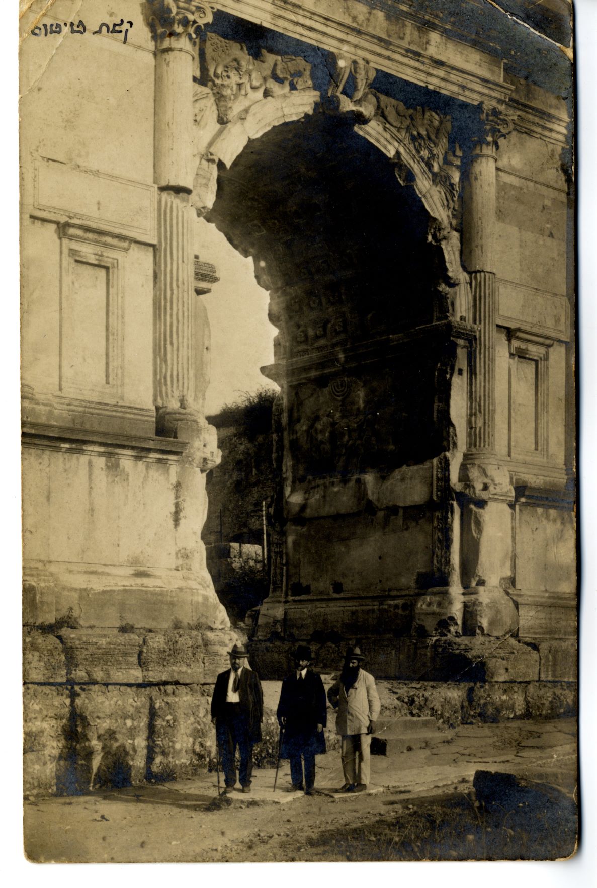 Rabbi Judah Leib Ha-Kohen Fishman Maimon is in the middle, flanked by Rabbi Meir Bar-Ilan [originally Berlin] on the left and Rabbi Shmuel Hayim Landau [Shahal] on the right. They are standing beside the Arch, not under it; the Spoils panel is visible in the background behind them. The perspective indicates how massive the Arch of Titus is in comparison to the men. Gift of the Leah Adler z"l Memorial Fund. This image was also published in a biography of Rabbi Shmuel Hayim Landau,, He-Mered Ha-Kadosh by Shabtai Don Yehiya, Tel Aviv: Moreshet, 1960, p. 125.